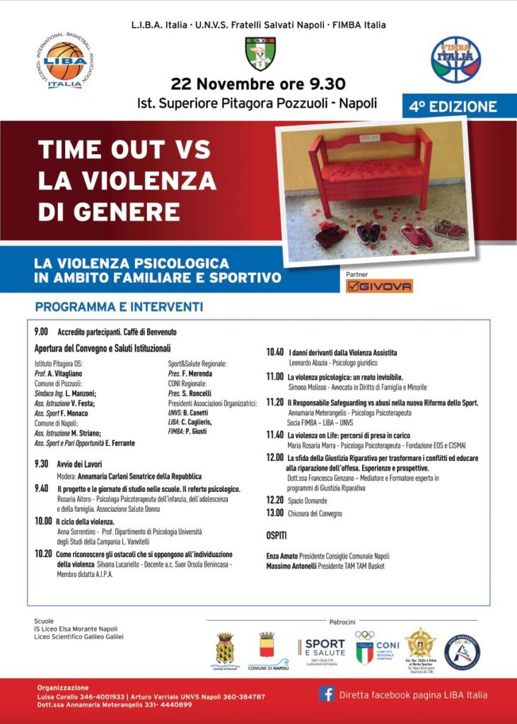 L’abuso psicologico dei bambini nello sport ha iniziato a ricevere attenzione alla fine degli anni ‘80. A partire dalla fine degli anni ‘90, alcuni paesi hanno iniziato lentamente ad introdurre politiche per proteggere i bambini negli ambienti sportivi. Le risposte strategiche a questo problema sono cruciali e devono basarsi su prove solide sulla portata e la natura . Nel convegno saranno trattati aspetti molto importanti sul tema Violenza ed abusi psicologici. L’evento è stato Promosso da LIBA ITALIA in partnership UNVS NAPOLI e FIMBA ITALIA , sarà moderato dalla Senatrice della Repubblica Annamaria Carloni. L’evento sarà patrocinato dal CONI CAMPANIA, Sport e Salute SPA, Comune di Napoli, Comune di Pozzuoli, Ansmes Napoli e AGAR SPORT MANAGEMENT.