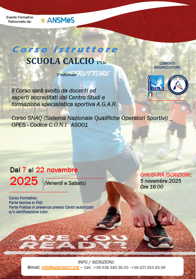 IL 29 Novembre 2025 , si è tenuta la prova finale del corso di Base Istruttori di Calcio Primo livello codici AS001 - AS002, giunta alla terza edizione con il patrocinio del Comitato ANSMeS di Napoli ORGANIZZATO DA AGAR SPORT E OPES APS.